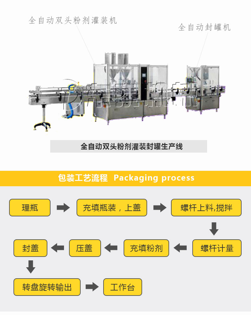 全自動粉劑灌裝機(jī)是我公司的主打產(chǎn)品,根據(jù)客戶的要求公司開發(fā)出了單頭、雙頭、四頭、六頭瓶裝生產(chǎn)線,全自動奶粉灌裝機(jī)專門針對藥品、保健品、食品行業(yè)的粉劑瓶裝。結(jié)合不同的客戶需求可配套:上料(螺桿、真空)、自動理瓶,單(雙)頭加塞、旋蓋、軋蓋、壓蓋等,鋁箔封口(風(fēng)冷、水冷),金檢,鋁箔塞墊,貼標(biāo),碼瓶熱收縮,裝盒,三維包裝(帶金線),裝箱等。