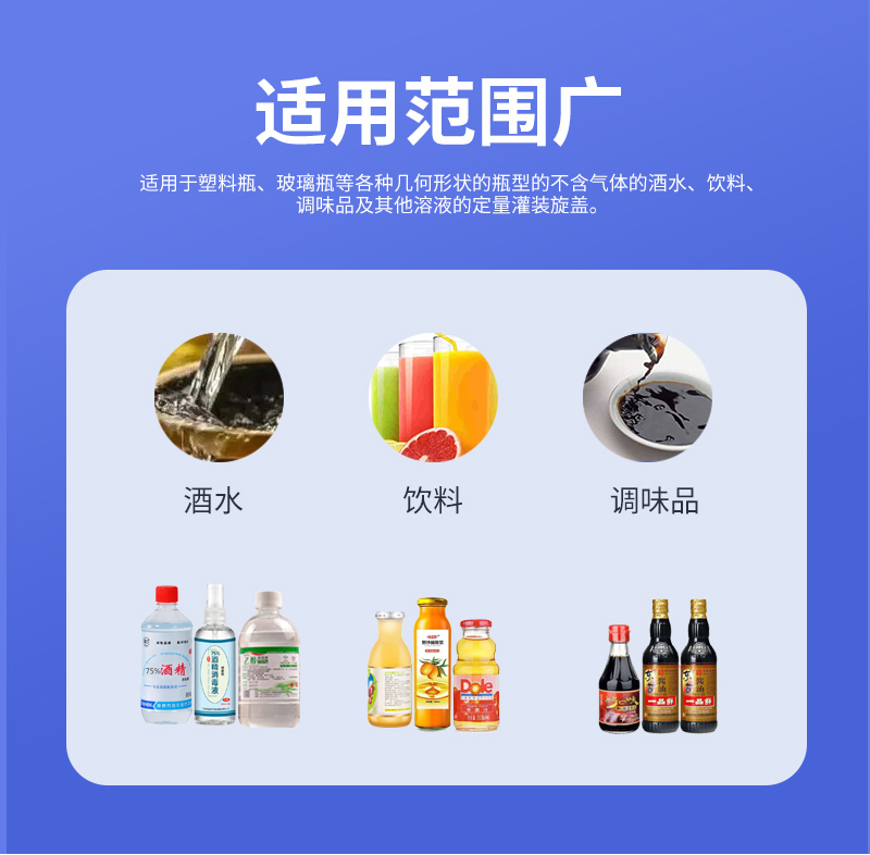 本機(jī)適用于多種材質(zhì),多種幾何形狀的容器,如塑料片、玻璃瓶、金屬瓶等;在需要更換瓶或蓋的時(shí)候,只要調(diào)整部分零件的位置即可,無需更換任何配件;在旋蓋過程中可以做到無瓶不下蓋。理蓋器、輸送機(jī)、旋蓋機(jī)、夾瓶皮帶速度可分別變頻調(diào)速,適應(yīng)在規(guī)定范圍內(nèi)的各類規(guī)格的旋蓋。(附:特殊規(guī)格定制即可)