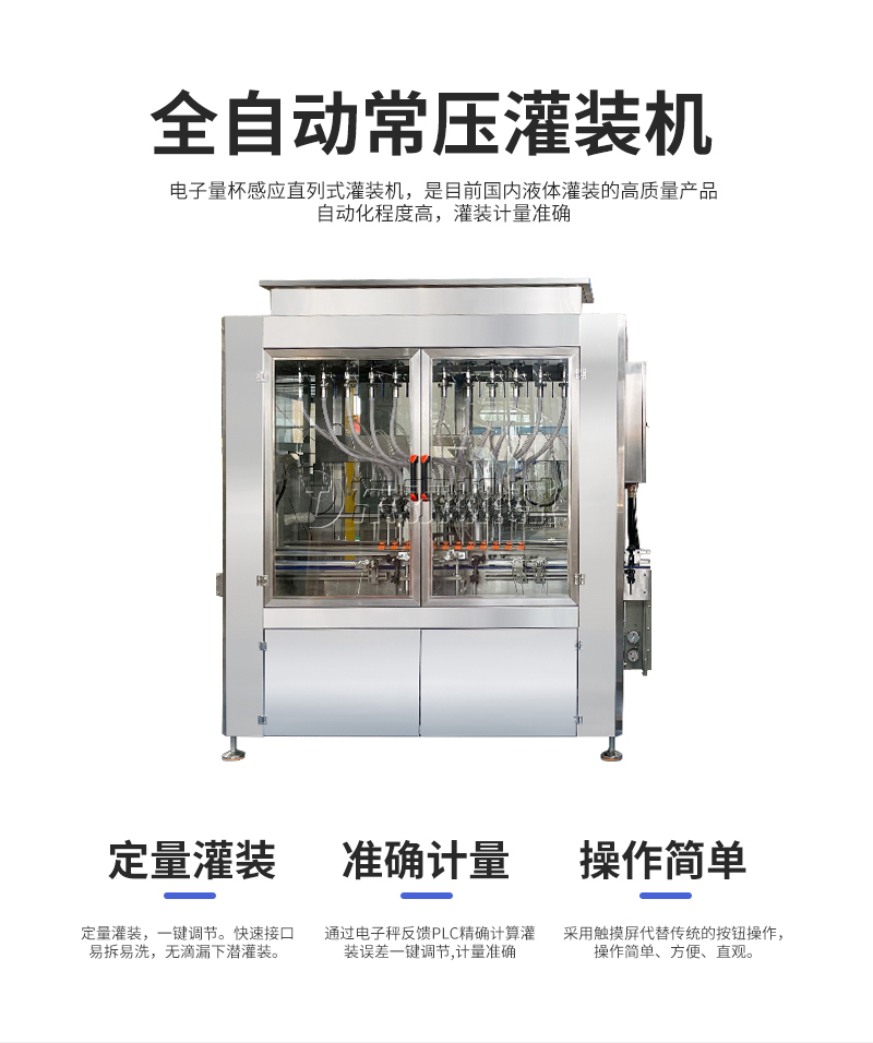 電子量杯感應(yīng)直列式灌裝機(jī),是目前國內(nèi)液體灌裝的高端產(chǎn)品,自動(dòng)化程度高,灌裝計(jì)量精確,適用于塑料瓶、玻璃瓶等各種幾何形狀的瓶型的不含氣體的酒水、飲料、調(diào)味品及其他溶液的定量灌裝。機(jī)器采用觸摸屏代替?zhèn)鹘y(tǒng)的按鈕操作,操作簡單、方便、直觀。科技含量高。機(jī)器灌裝計(jì)量可通過觸摸屏對(duì)灌裝時(shí)間的調(diào)整實(shí)現(xiàn)不同計(jì)量灌裝,方便操作者使用。
