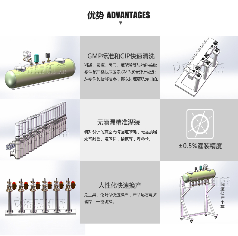 F、灌裝閥由氣動(dòng)閥控制,灌裝精度更高。