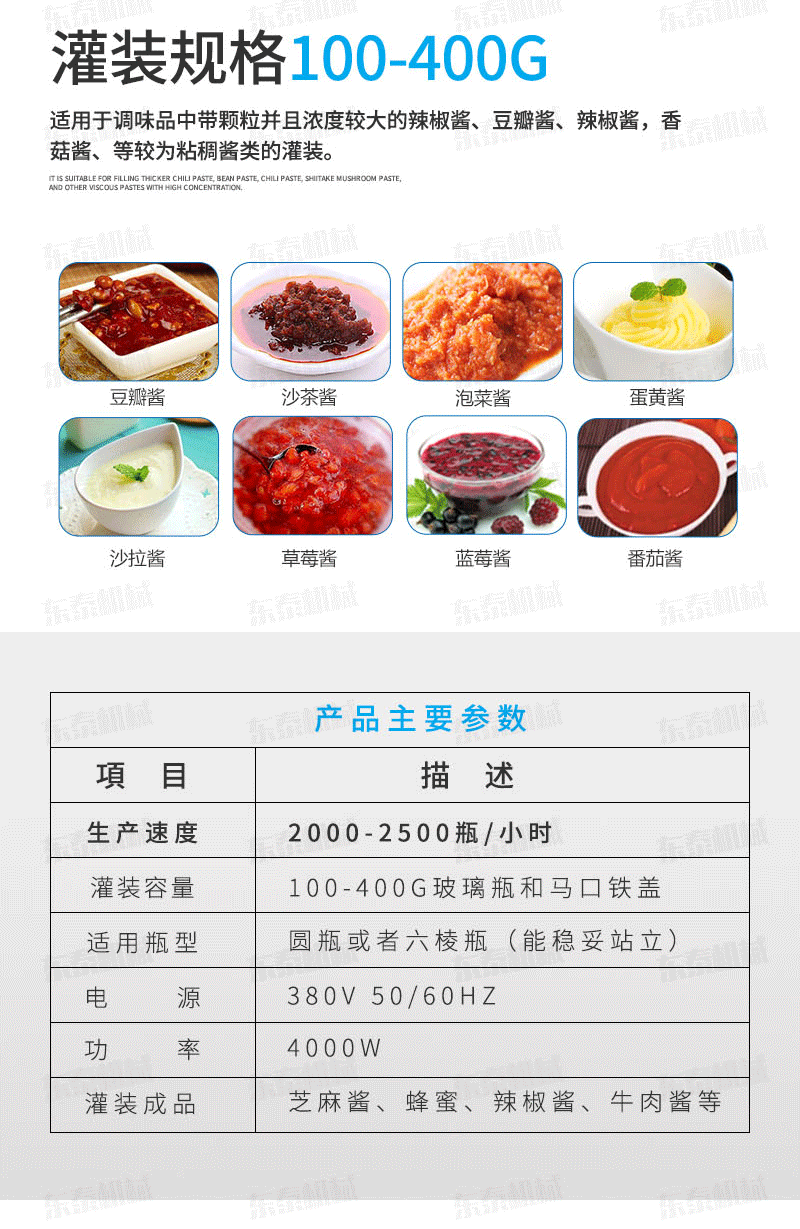 辣椒醬灌裝機(jī)采用活塞式灌裝原理,適用于調(diào)味品中帶顆粒并且濃度較大的辣椒醬、豆瓣醬、花生醬、香菇醬、果醬、牛油火鍋底料、紅油火鍋底料、蝦醬等較為粘稠醬類(lèi)的灌裝。