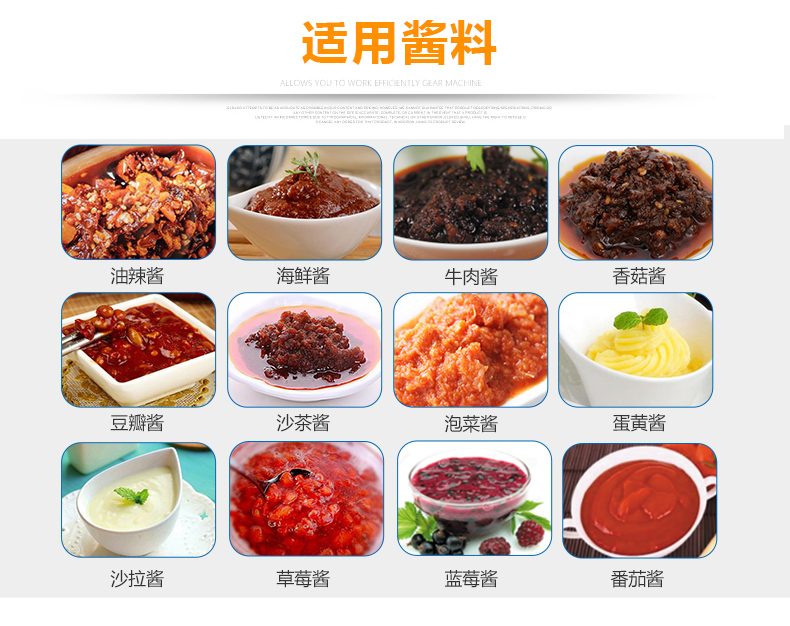 顆粒醬灌裝機(jī)采用活塞式灌裝原理,適用于調(diào)味品中帶顆粒并且濃度較大的辣椒醬、豆瓣醬、花生醬、香菇醬、果醬、牛油火鍋底料、紅油火鍋底料、蝦醬等較為粘稠醬類(lèi)的灌裝。