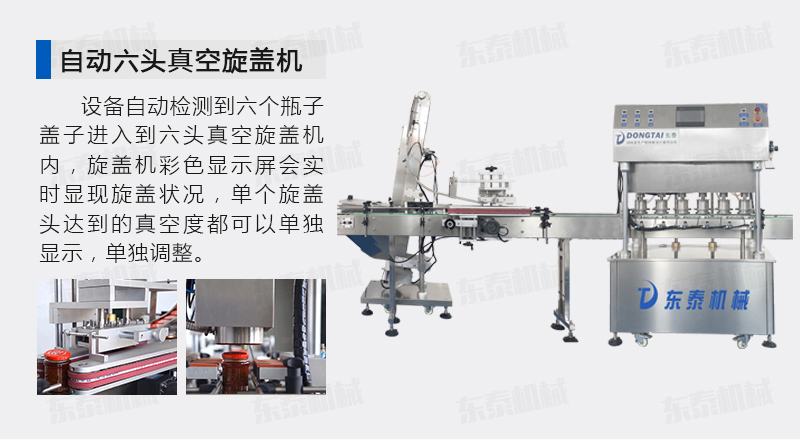 該直線式真空旋蓋機(jī)是東泰機(jī)械結(jié)合用戶使用的情況,摒棄了傳統(tǒng)轉(zhuǎn)盤式真空旋蓋機(jī)的弊端,研制開發(fā)的設(shè)備,設(shè)備自動(dòng)檢測(cè)到六個(gè)瓶子蓋子進(jìn)入到六頭真空旋蓋機(jī)內(nèi),旋蓋機(jī)彩色顯示屏?xí)䦟?shí)時(shí)顯現(xiàn)旋蓋狀況,整機(jī)多點(diǎn)檢測(cè),當(dāng)進(jìn)口無(wú)瓶無(wú)蓋、出口堵塞、定位不準(zhǔn)、瓶身傾倒均自動(dòng)停機(jī)。單個(gè)旋蓋頭達(dá)到的真空度都可以單獨(dú)顯示,單獨(dú)調(diào)整!