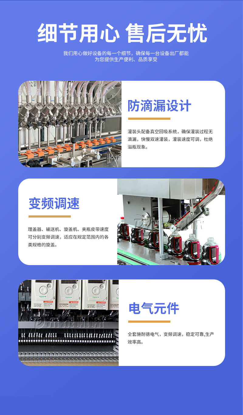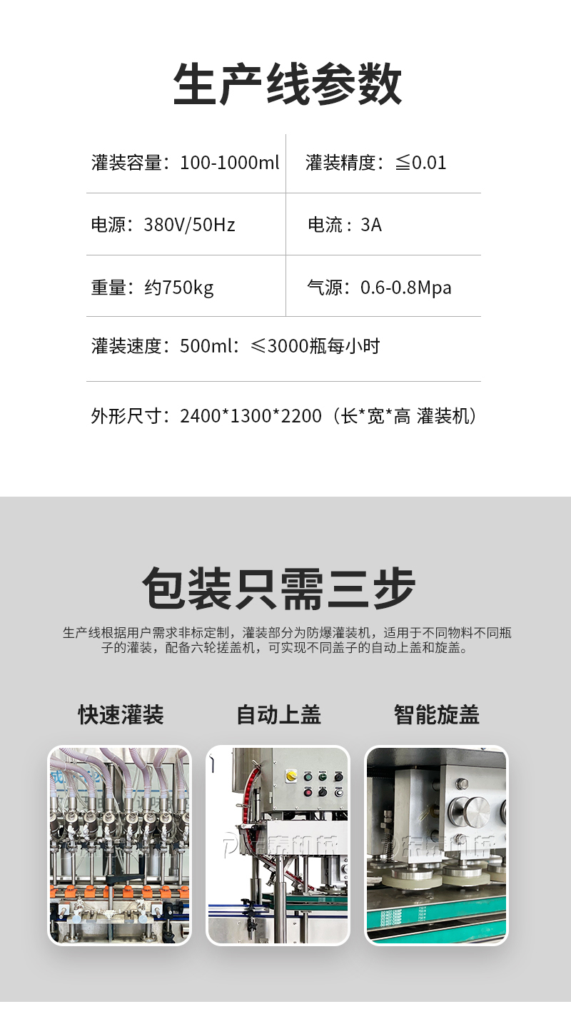 電子量杯感應(yīng)直列式灌裝機(jī),是目前國內(nèi)液體灌裝的高端產(chǎn)品,自動(dòng)化程度高,灌裝計(jì)量精確,適用于塑料瓶、玻璃瓶等各種幾何形狀的瓶型的不含氣體的酒水、飲料、調(diào)味品及其他溶液的定量灌裝。機(jī)器采用觸摸屏代替?zhèn)鹘y(tǒng)的按鈕操作,操作簡單、方便、直觀。科技含量高。機(jī)器灌裝計(jì)量可通過觸摸屏對(duì)灌裝時(shí)間的調(diào)整實(shí)現(xiàn)不同計(jì)量灌裝,方便操作者使用。