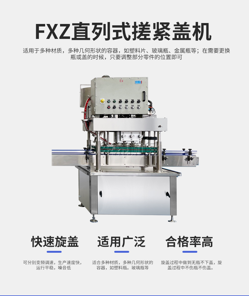 本機(jī)適用于多種材質(zhì),多種幾何形狀的容器,如塑料片、玻璃瓶、金屬瓶等;在需要更換瓶或蓋的時(shí)候,只要調(diào)整部分零件的位置即可,無需更換任何配件;在旋蓋過程中可以做到無瓶不下蓋。理蓋器、輸送機(jī)、旋蓋機(jī)、夾瓶皮帶速度可分別變頻調(diào)速,適應(yīng)在規(guī)定范圍內(nèi)的各類規(guī)格的旋蓋。(附:特殊規(guī)格定制即可)