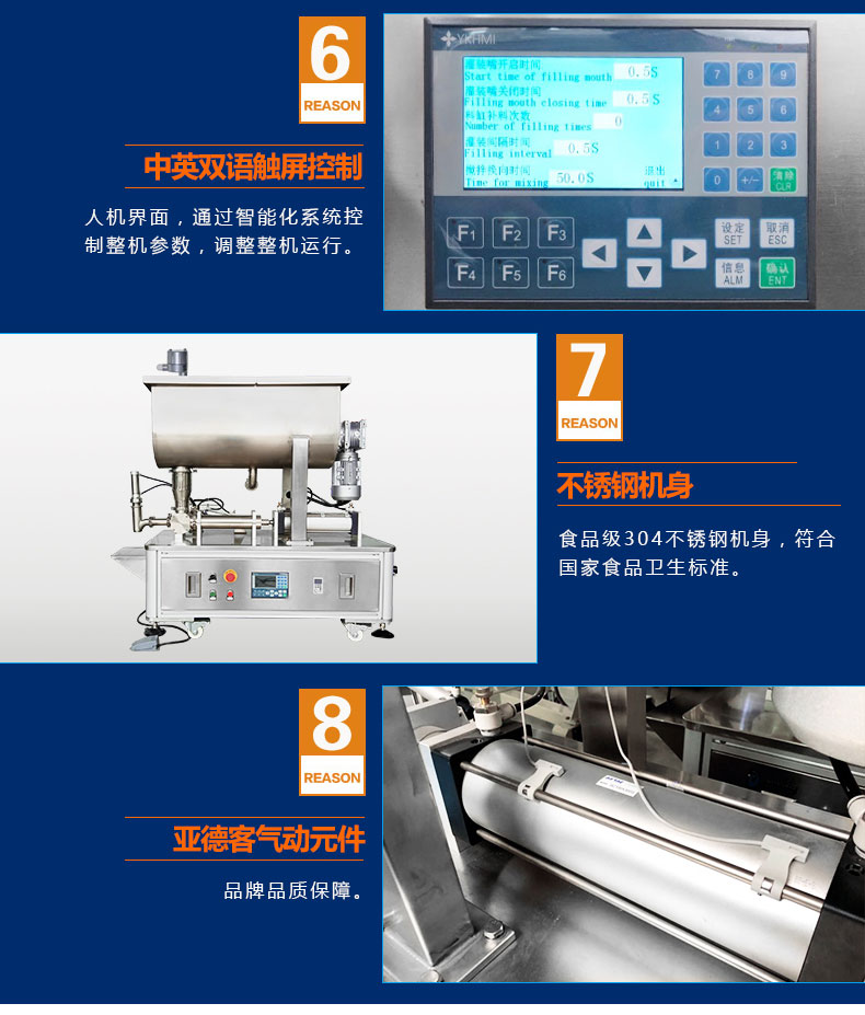 產(chǎn)品簡介:半自動醬類醬料灌裝機SFM系列結(jié)構(gòu)合理、機型小巧、性能可靠、定量準確、操作方便。整機304不銹鋼,灌裝悶頭防漏料防滴油,氣缸驅(qū)動結(jié)構(gòu),加大200L料斗,品牌全鋁殼銅芯大功率攪拌電機,變頻調(diào)速,PLC智能控制,用戶可根據(jù)需要任意調(diào)節(jié)灌裝量及灌裝速度,灌裝精度高。